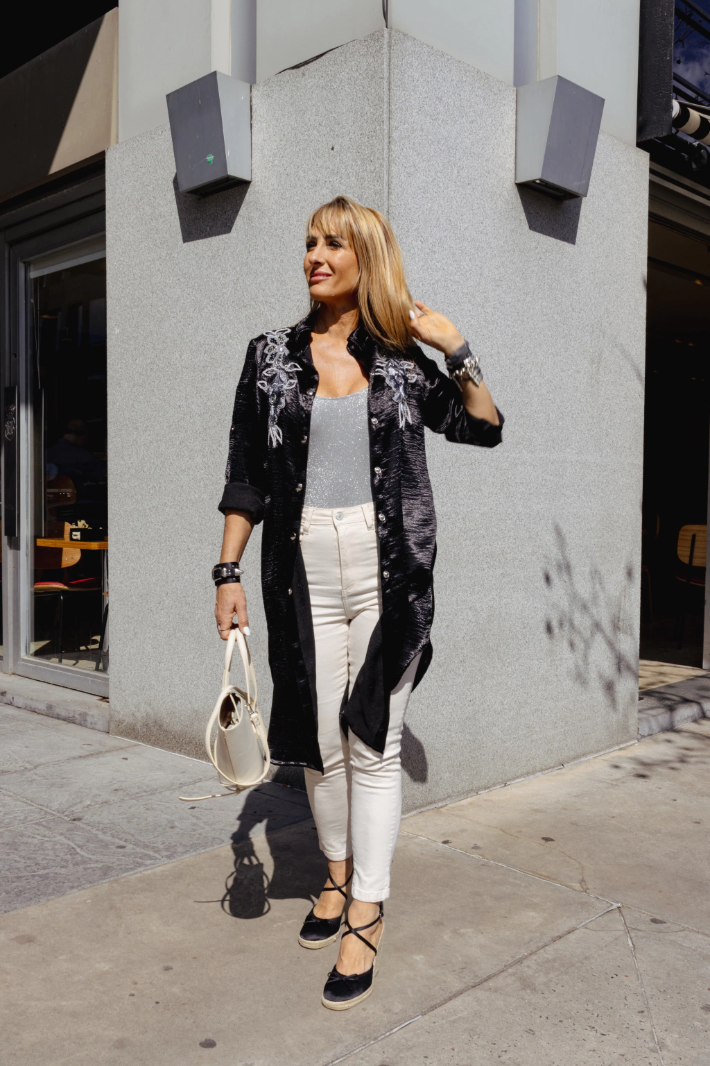 Spolverino confeccionado en viscosa de seda. Bordado a mano en el frente en dorado tostado y crudo. Su tacto suave y fluido se amolda a tu silueta de tu cuerpo y te acompaña elegantemente en cada movimiento , te abraza y estiliza gracias a su corte y perfecta caída