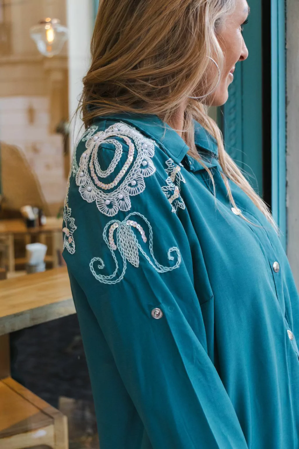 Camisa confeccionada en viscosa. Bordado a mano en el frente en dorado tostado y crudo. Su tacto suave y fluido se amolda a tu silueta de tu cuerpo y te acompaña elegantemente en cada movimiento , te abraza y estiliza gracias a su corte y perfecta caída
