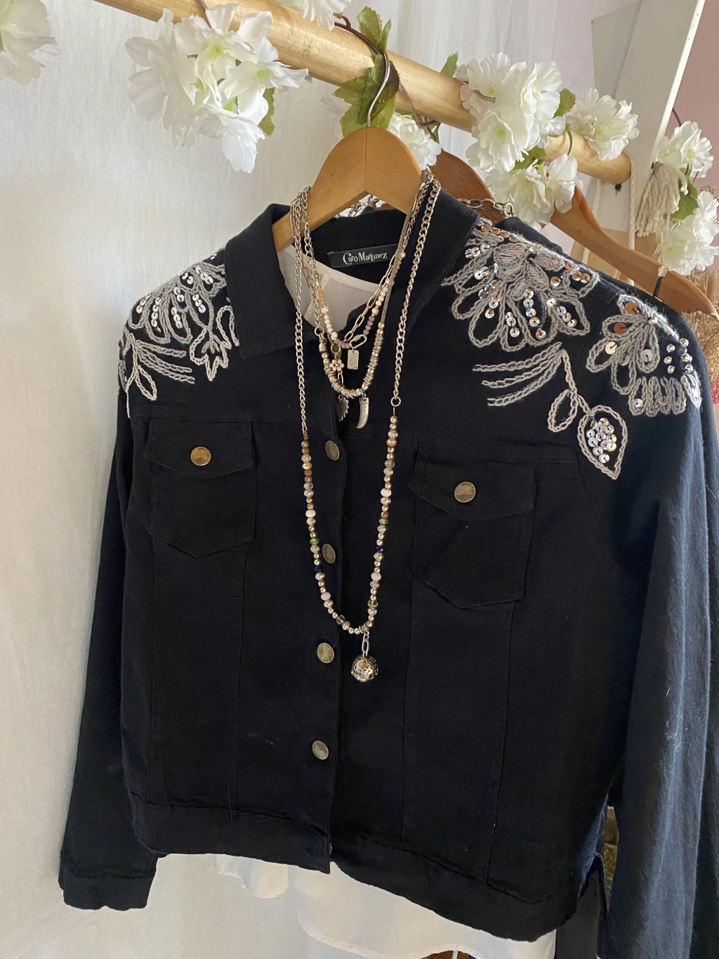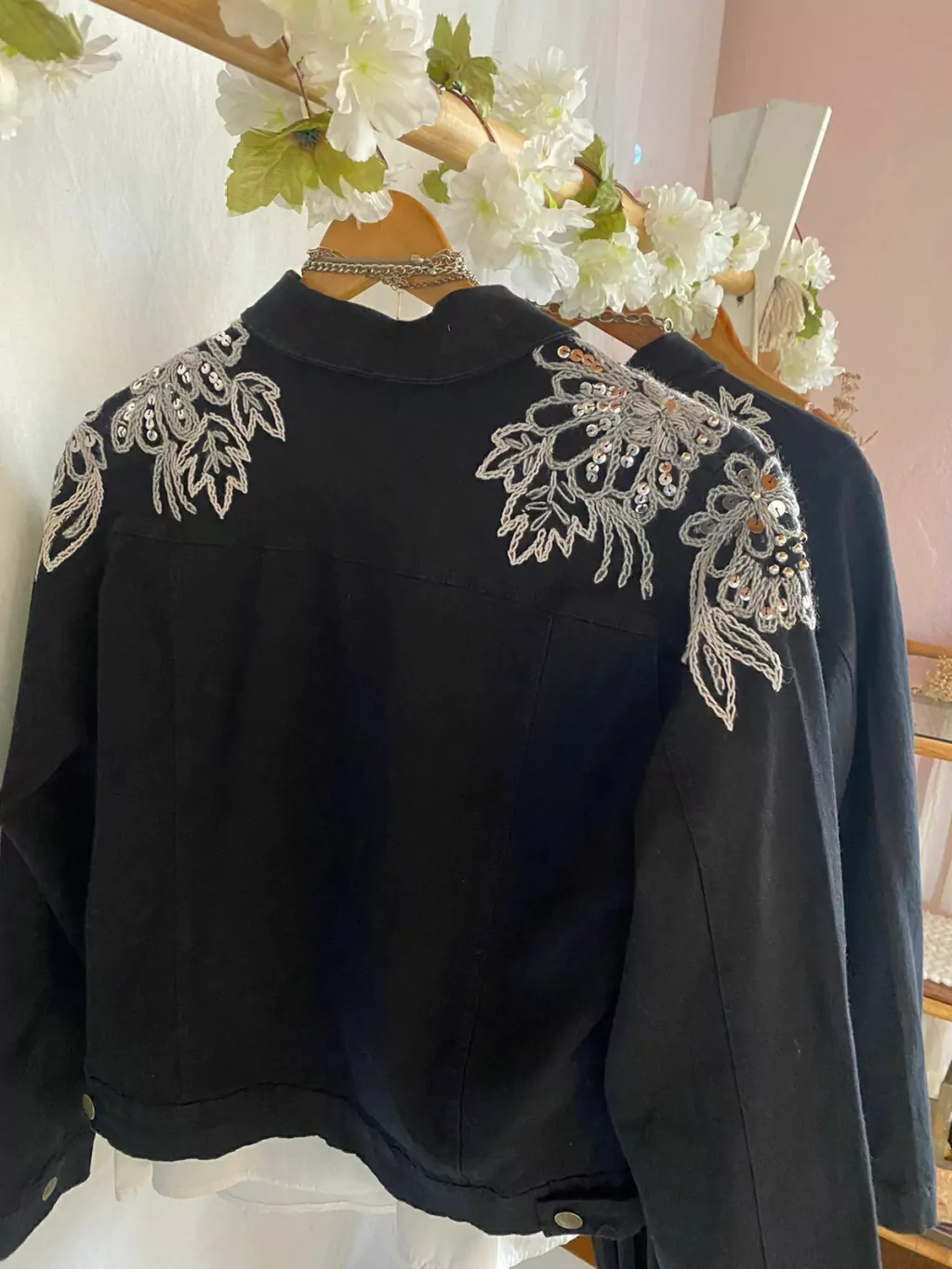 Chaqueta de gabardina negra elastizada bordada a mano.