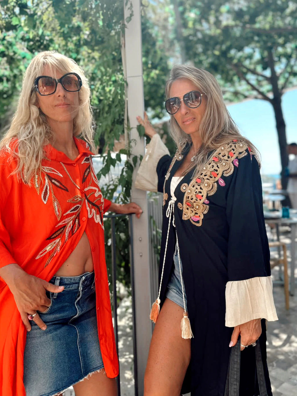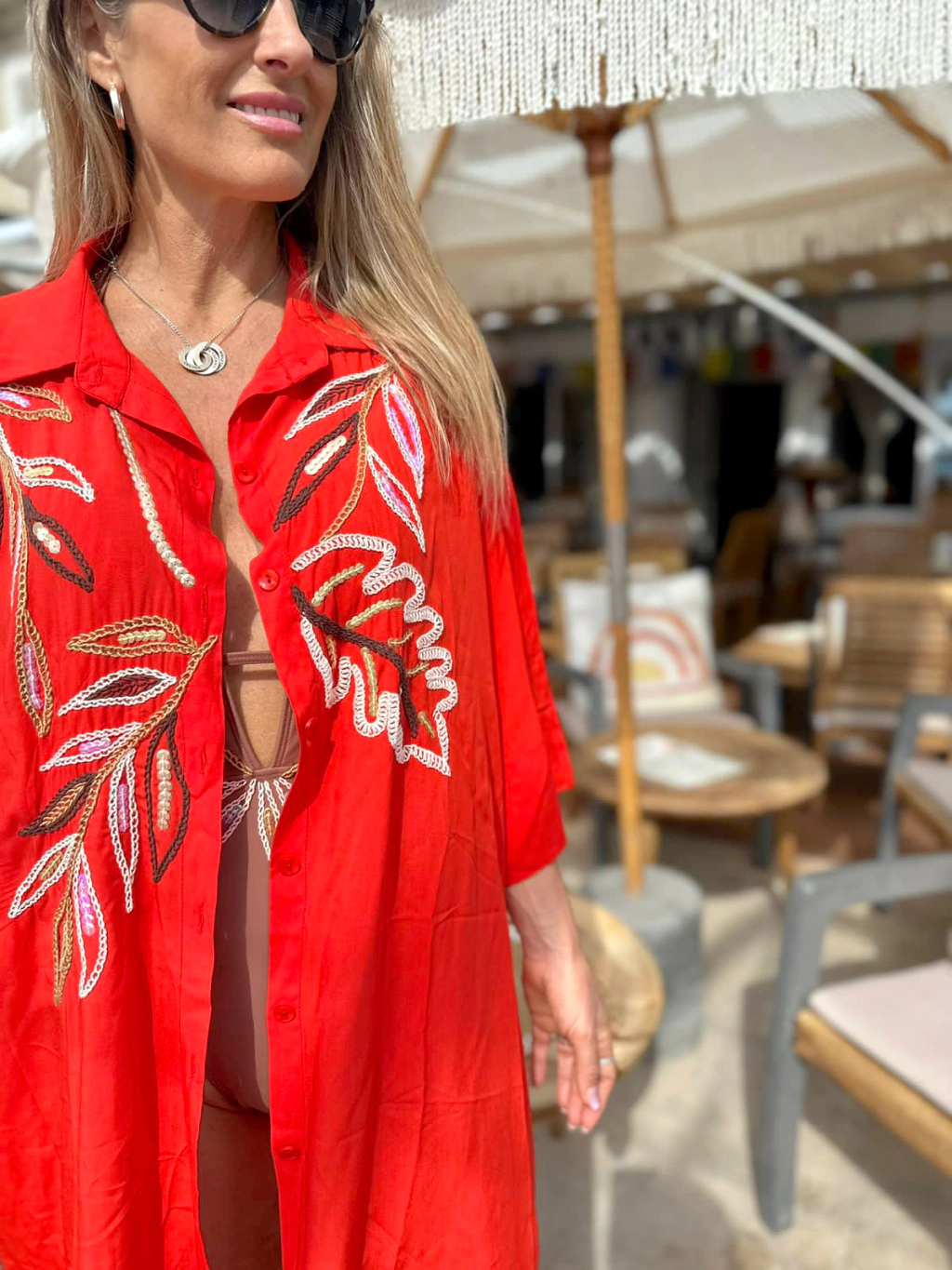 Blusa oversize confeccionada en viscosa. El frente presenta bordados de hilo con apliques de lentejuelas en dorado y crudo y ocre, hecho 100% a mano por artesanos. Las mangas son 3/4, hasta el codo.
