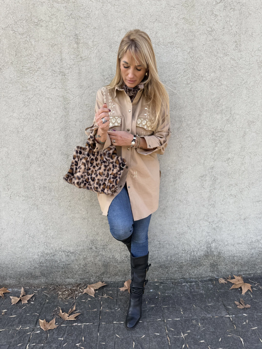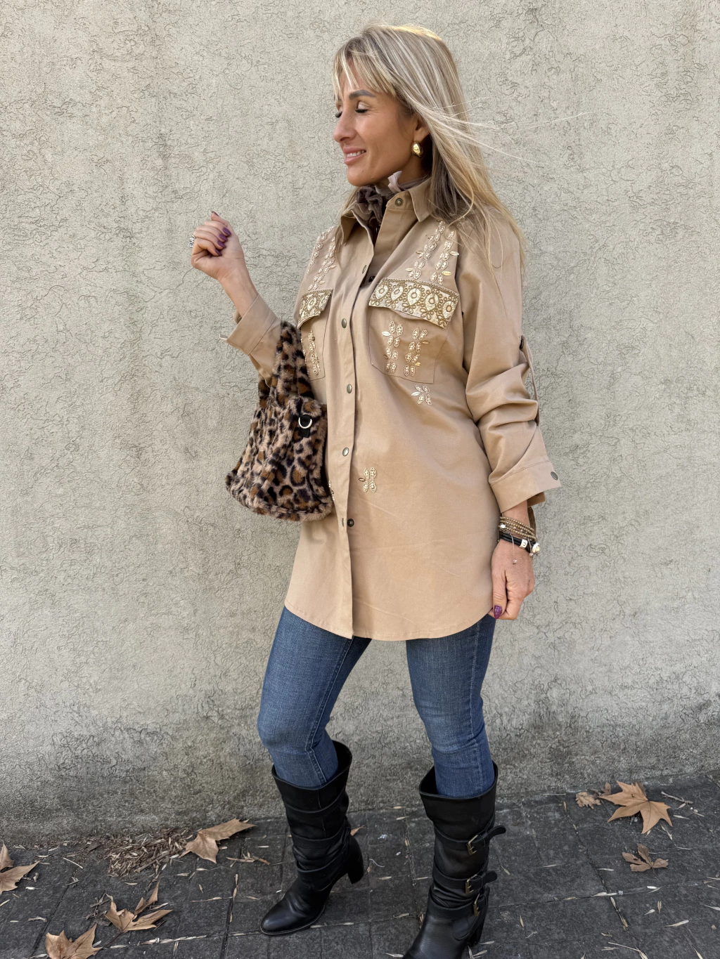 Delicadeza y calidez. Camisaco de gabardina color arena con bordado en tonos suaves y destellos dorados.