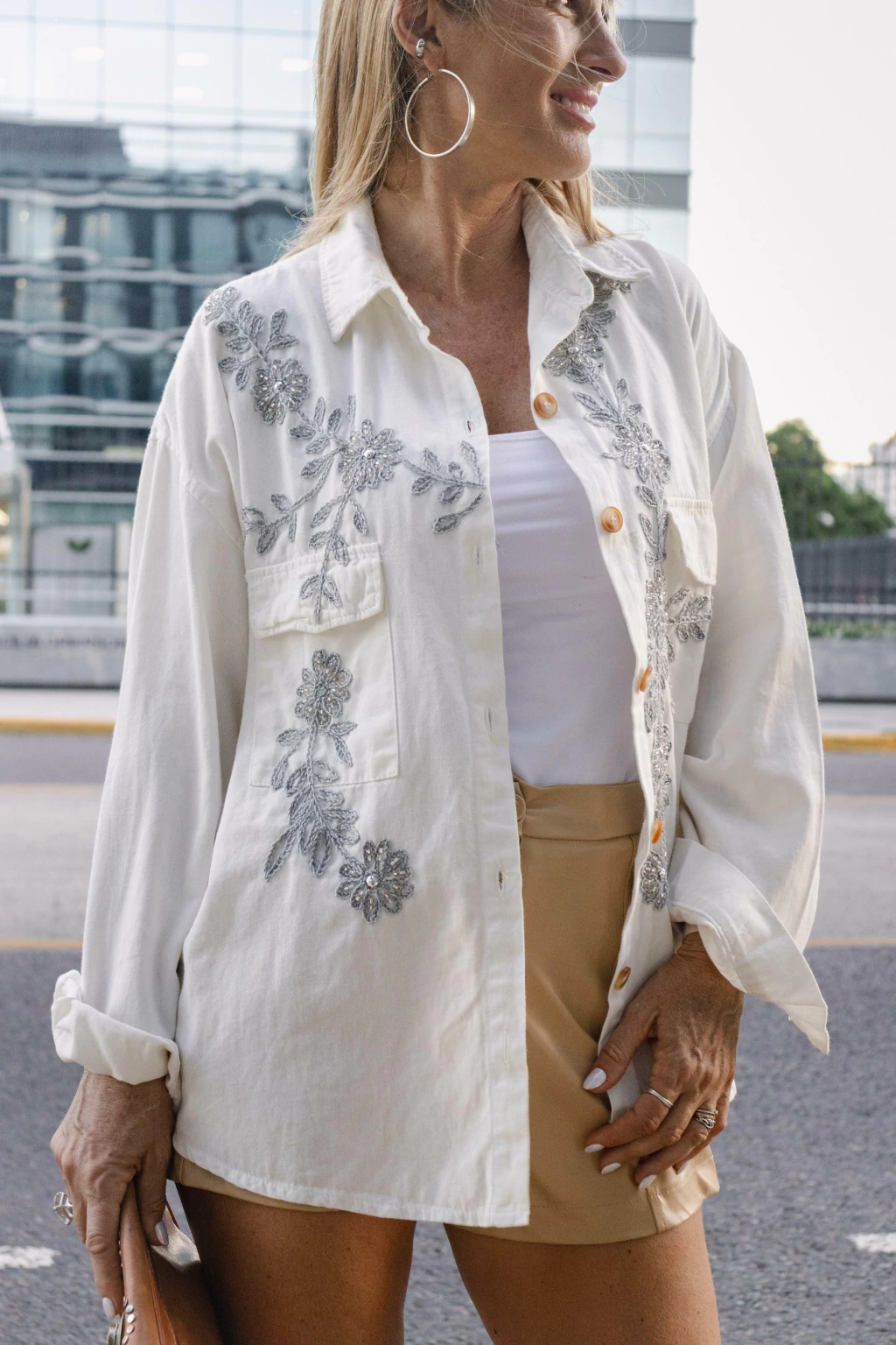 Camisaco confeccionado en gabardina . Posee bordado realizado a mano con pedreria e hilos en el frente.