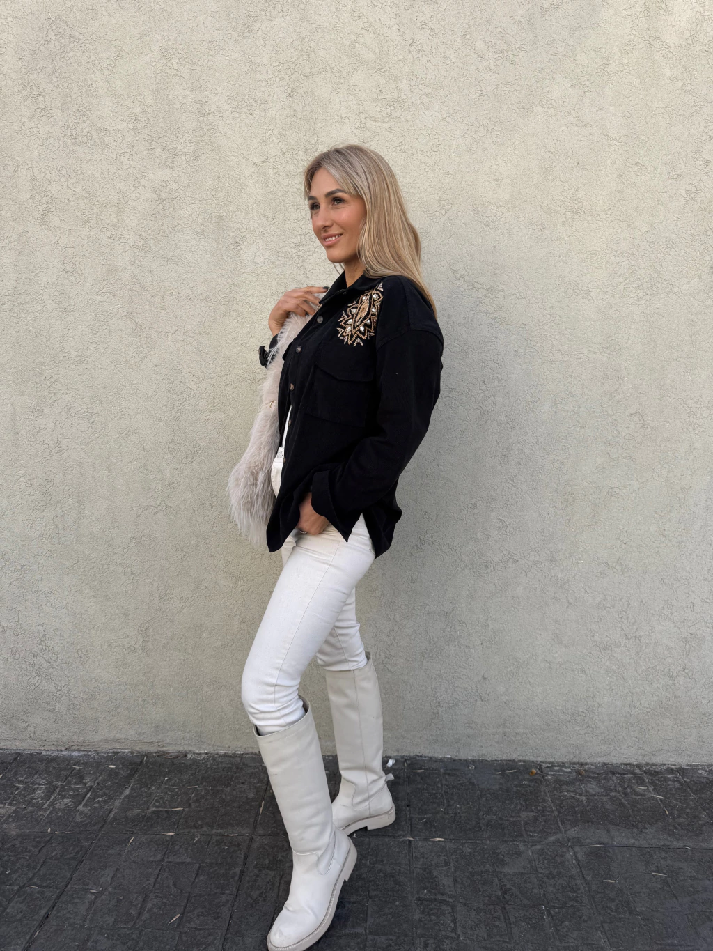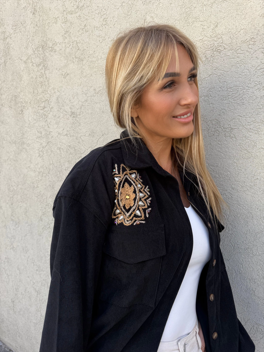 Un clásico con actitud. Este camisaco de corderoy negro tiene el detalle que lo hace único: un mandala bordado a mano en la espalda, con hilo crudo y dorado, cargado de energía.