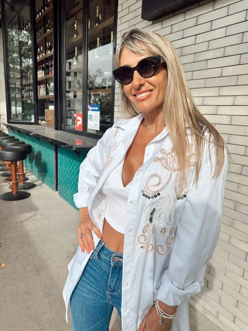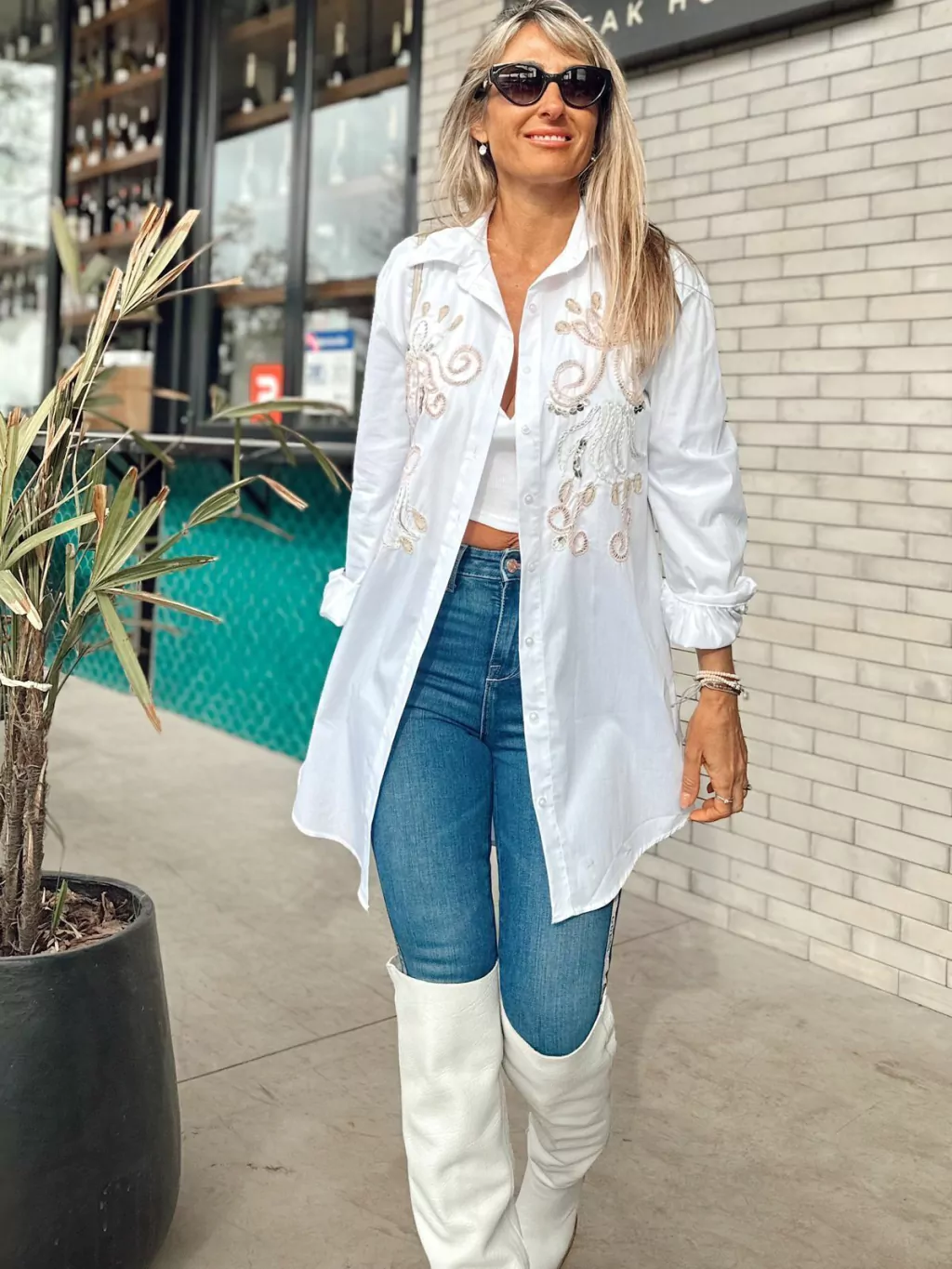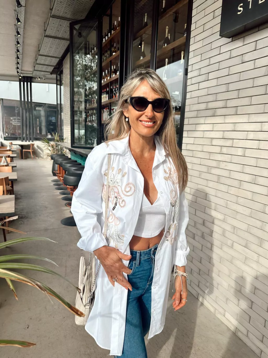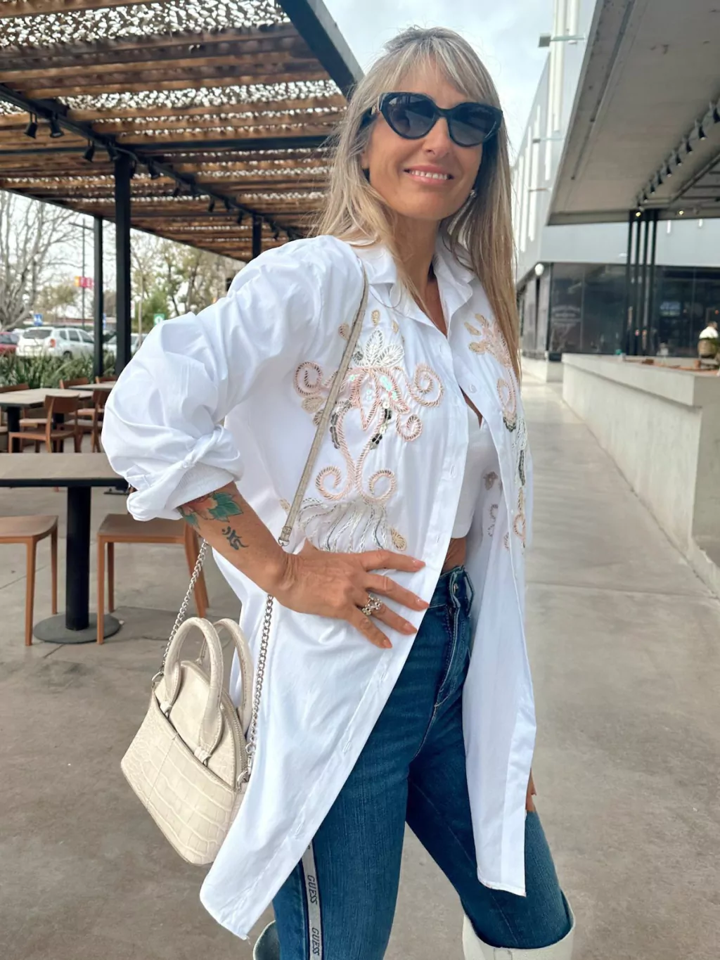 Blusa confeccionada en poplin. Posee bordados en el frente realizados a mano en hilos color crudo, rosa y tostado y aplicaciones de lentejuelas en plata.