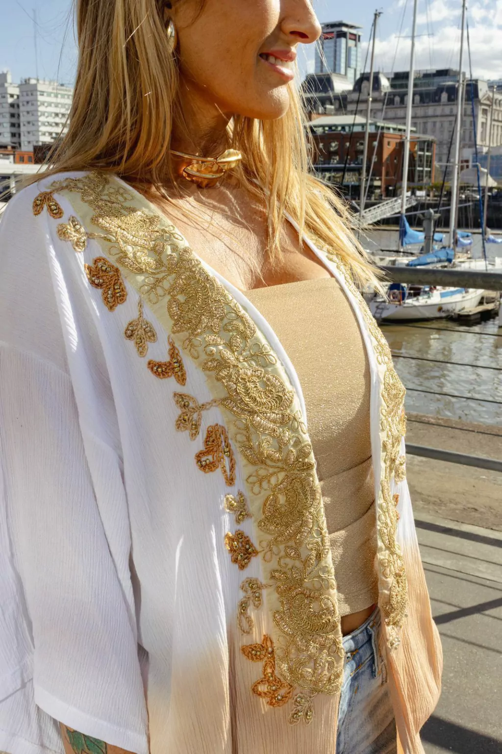 kimono de gasa de algodon bordado a mano en hombros y teñido batyk.