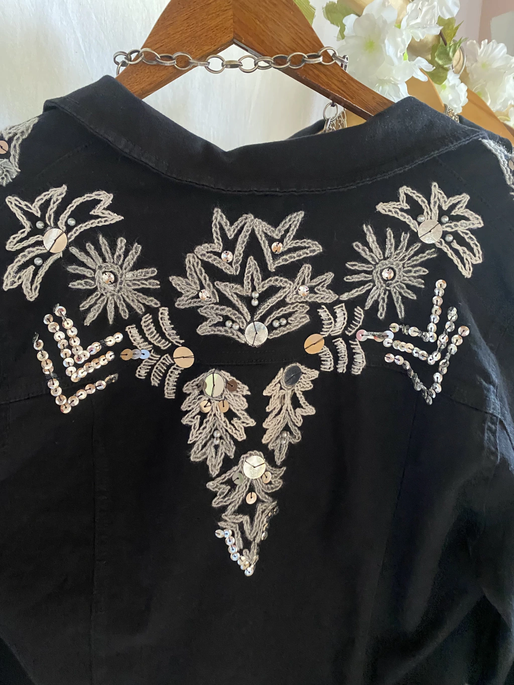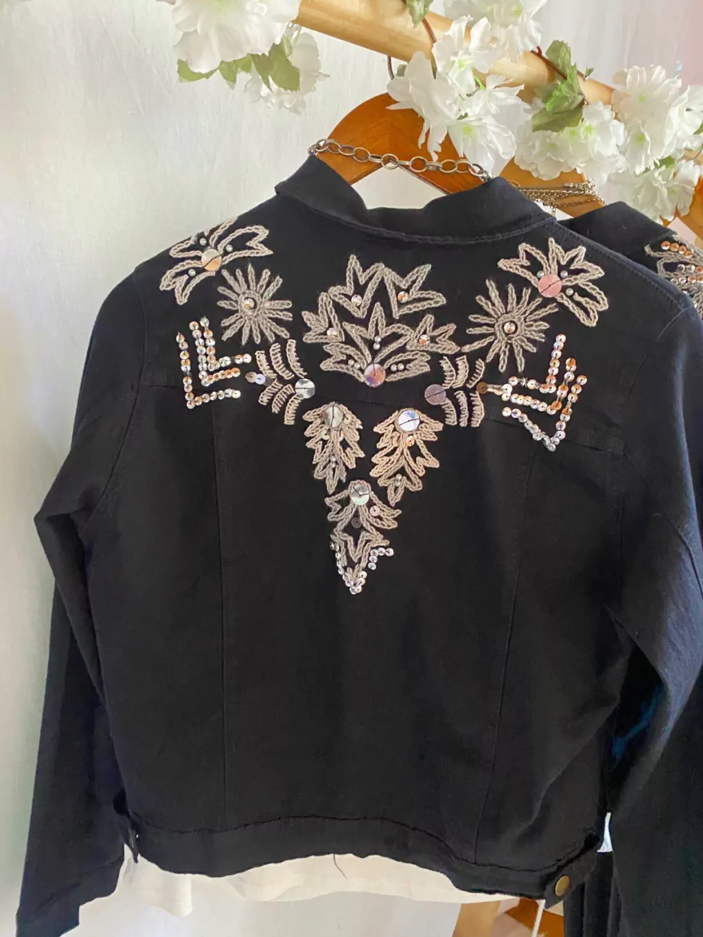 Chaqueta confeccionada en gabardina negra elastizada. Esta bordada a mano en el frente y la espalda con hilos y pedreria plateados.