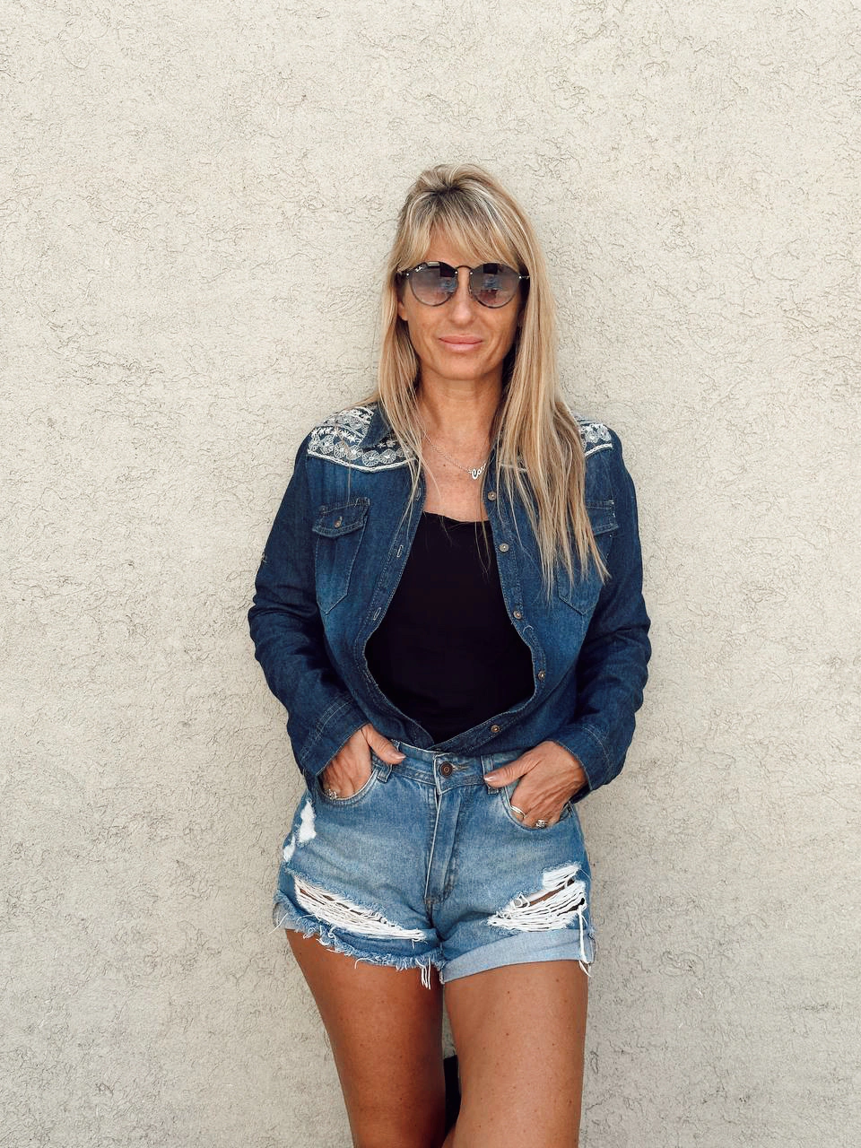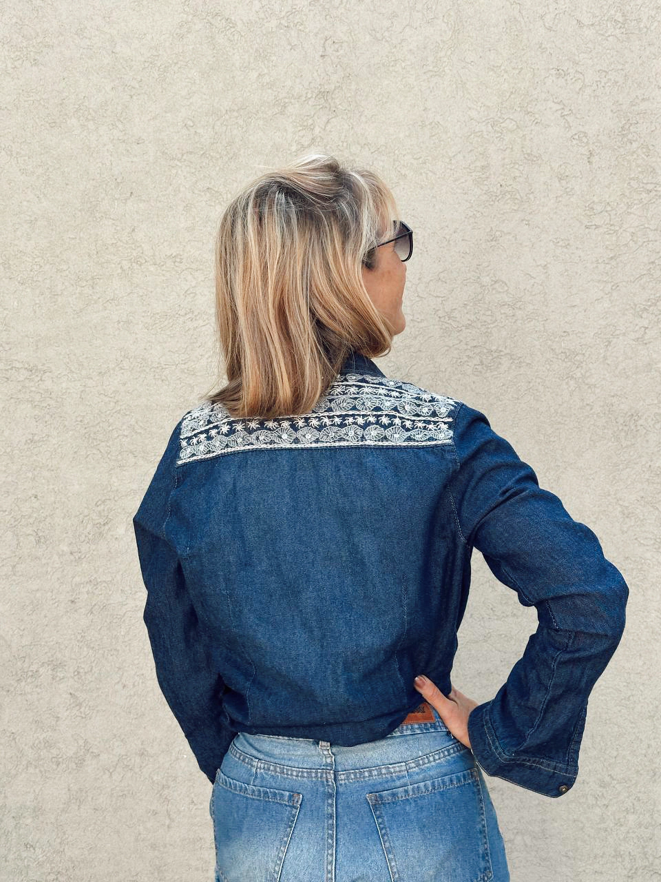 Camisa confeccionada en jean elastizado. Posee bordado realizado a mano con pedreria e hilos y guarda de la India en el frente y espalda.