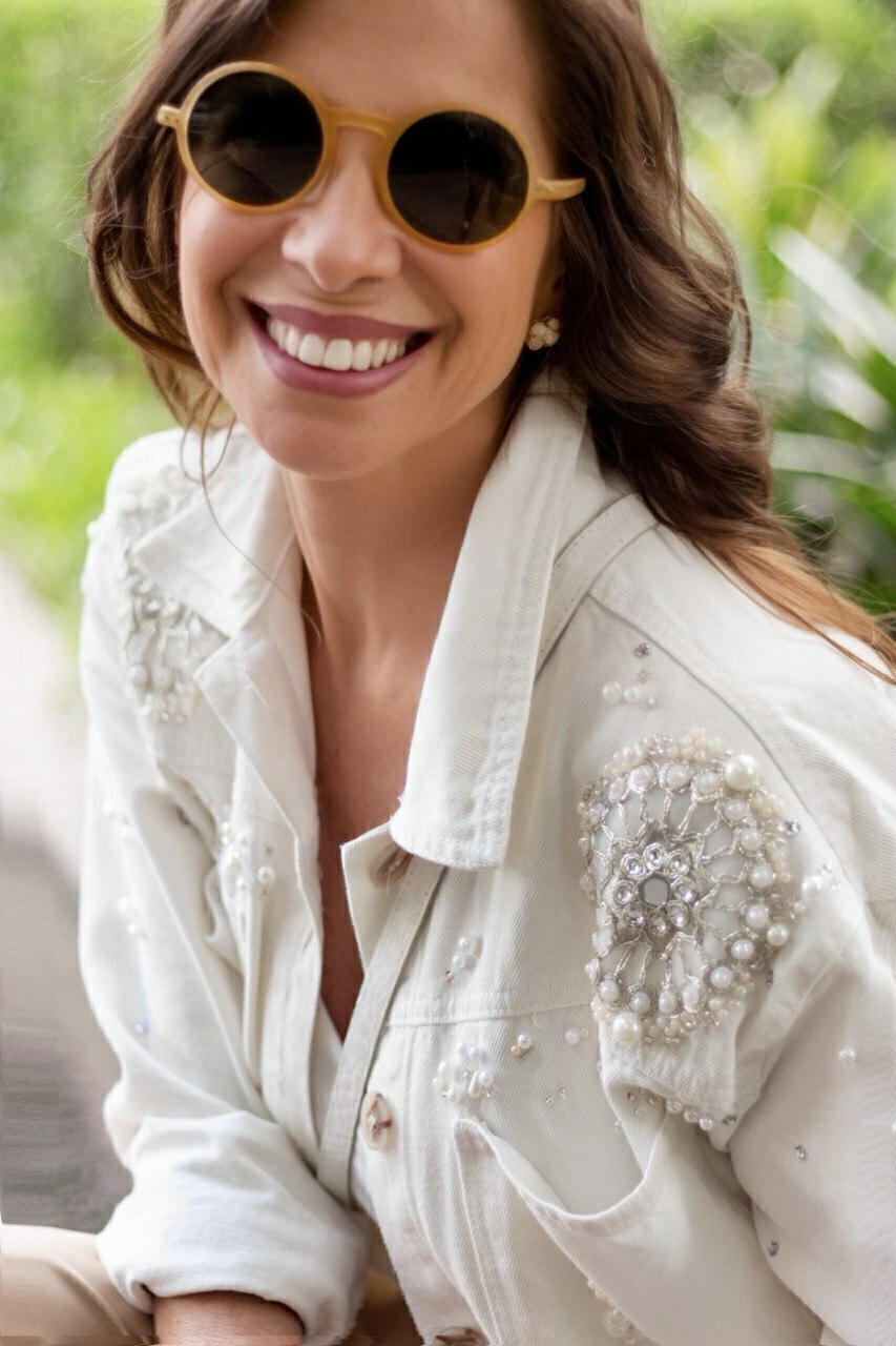 Camisaco confeccionado en gabardina . Posee bordado realizado a mano con pedreria e hilos en hombros, el frente y las mangas .