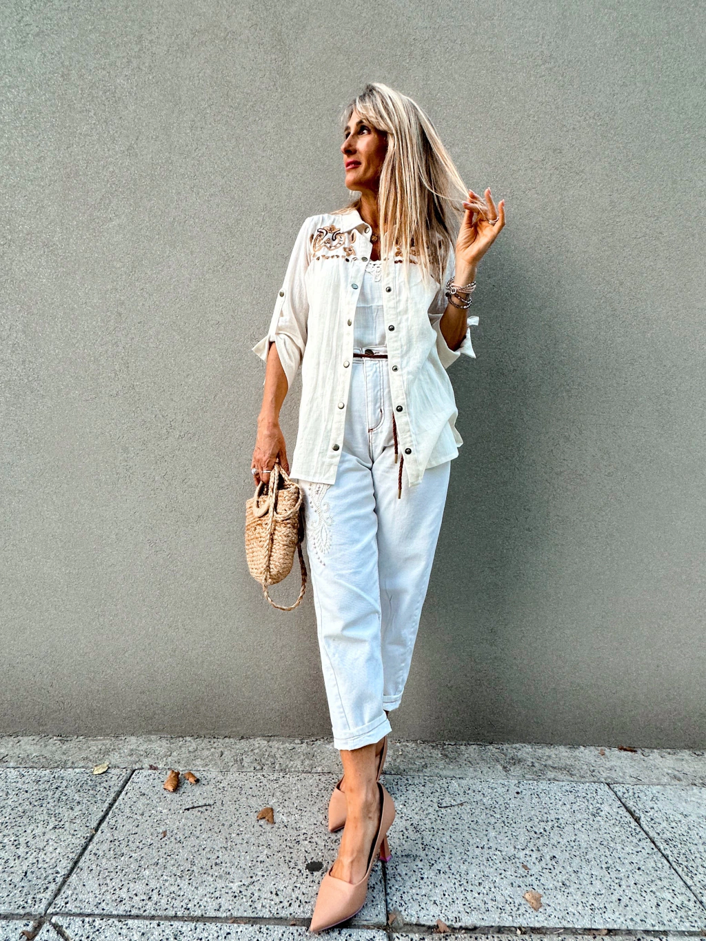 Blusa confeccionada en gasa de algodon. Posee bordados en el frente y en la espalda realizados a mano con hilos y aplicaciones de lentejuelas. Acceso mediante broches a presion en el frente.