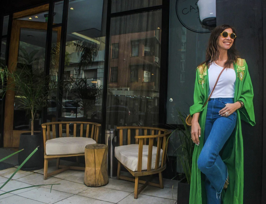 Kimono confeccionado en color verde. Bordado a mano en el frente y espalda en dorado, crudo y tostado, con aplicaciones de bordados hechos en la India.