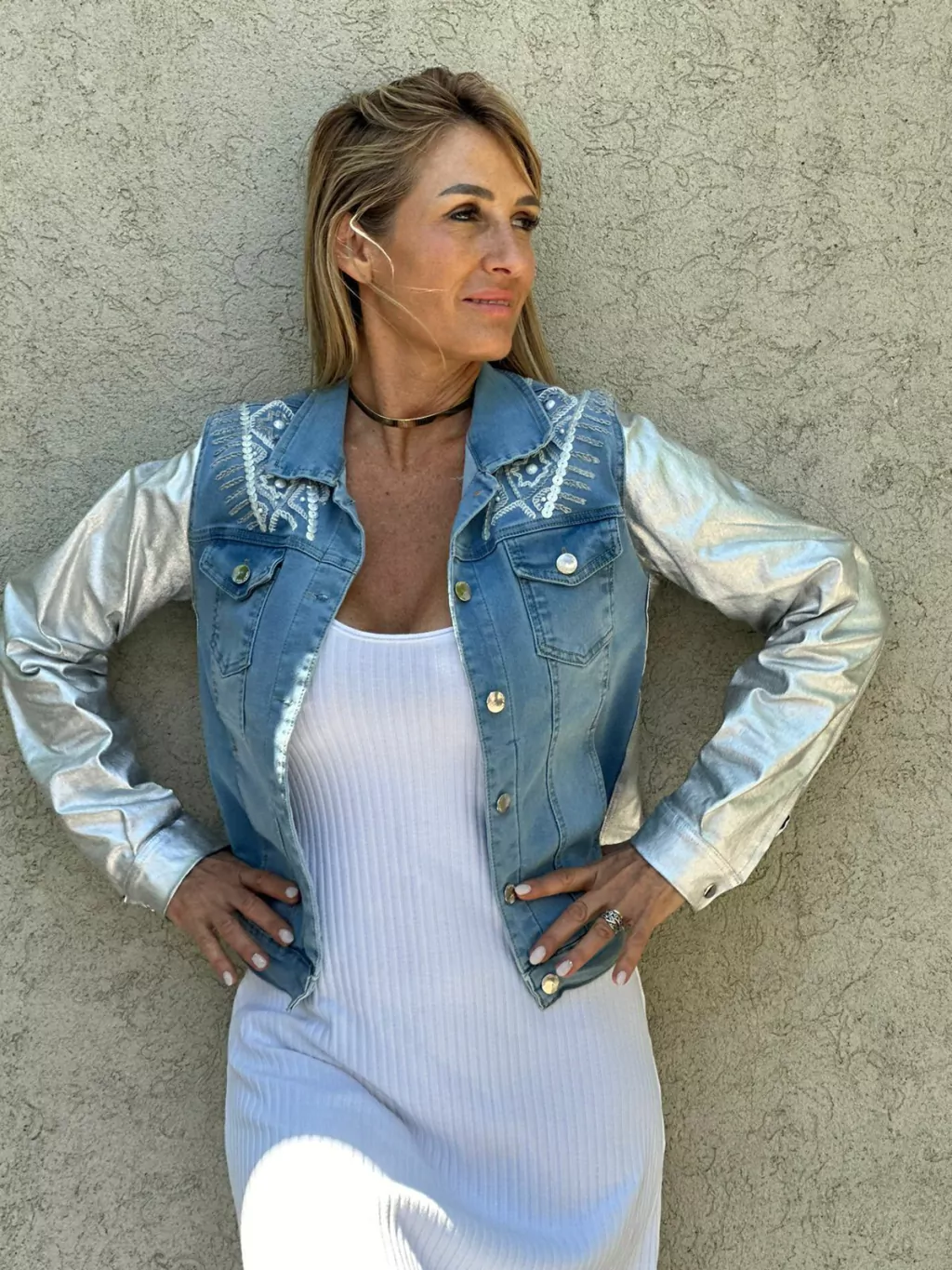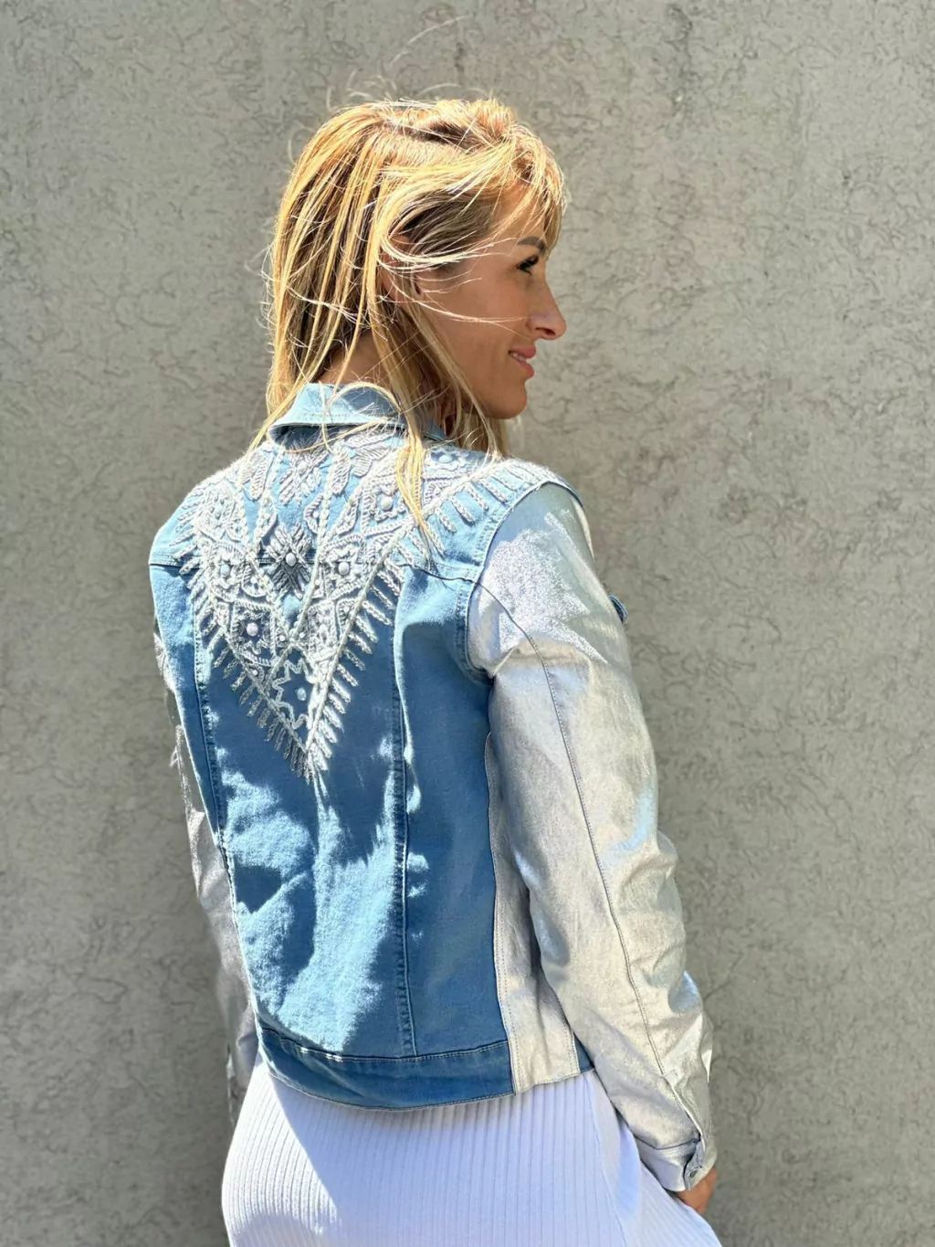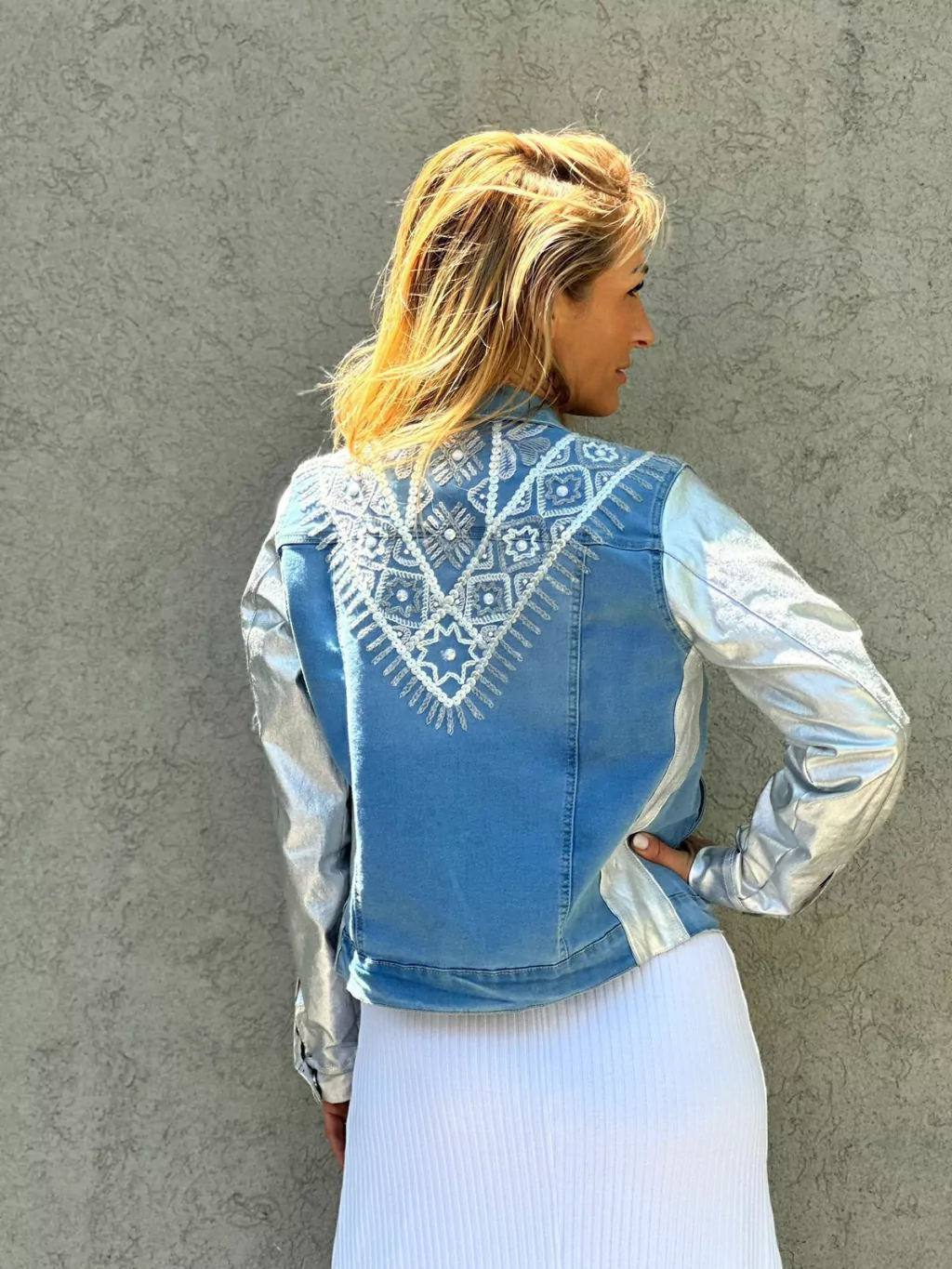 Chaqueta de jean con mangas plateada. Posee bordados en el frente, hombros y espalda a contratono realizados a mano en hilos y aplicaciones de lentejuelas.