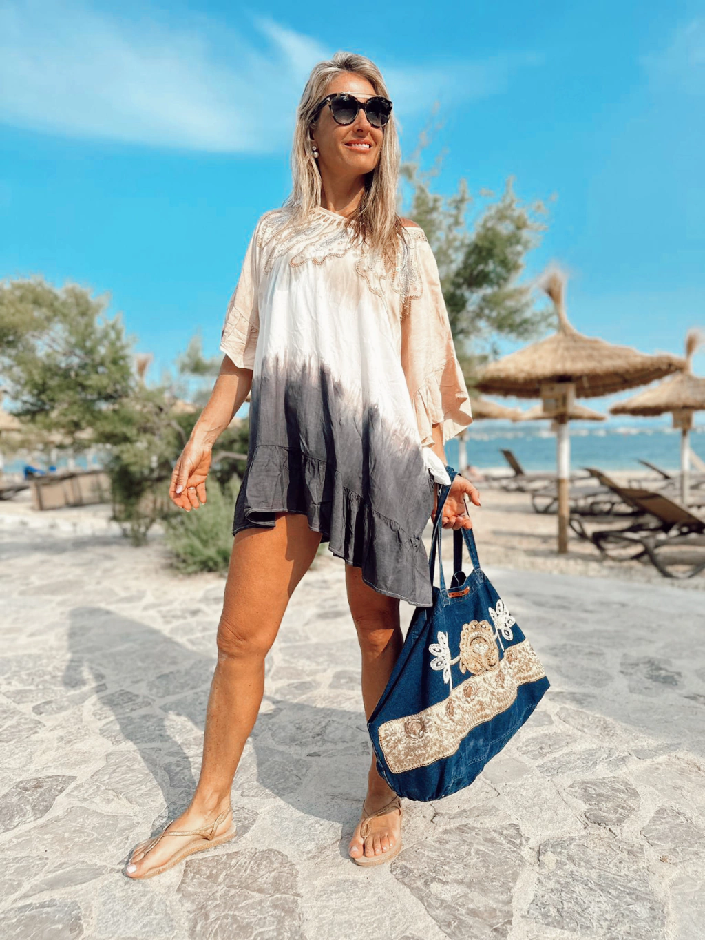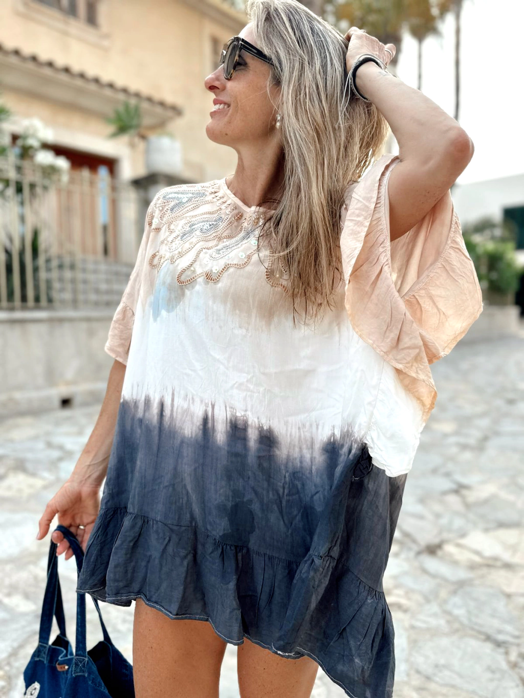 Remeron tipo túnica confeccionada en viscosa, teñido en batik y bordada en tonos Plata y tostado.