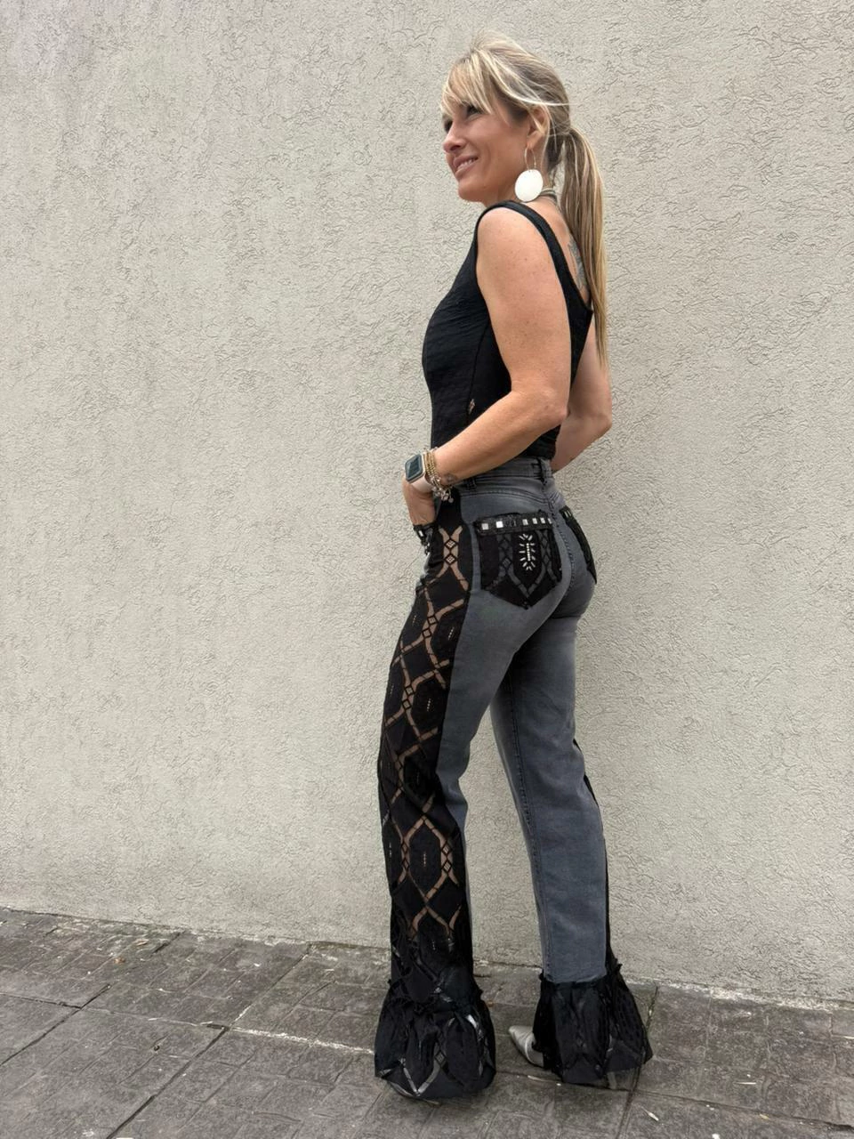 Pantalón Black es una pieza artesanal única, confeccionada a partir de la transformación de un Jean de gabardina. Su diseño patchwork combina recortes de denim, encaje bordado y detalles de strass que le aportan un brillo especial y mucha personalidad.