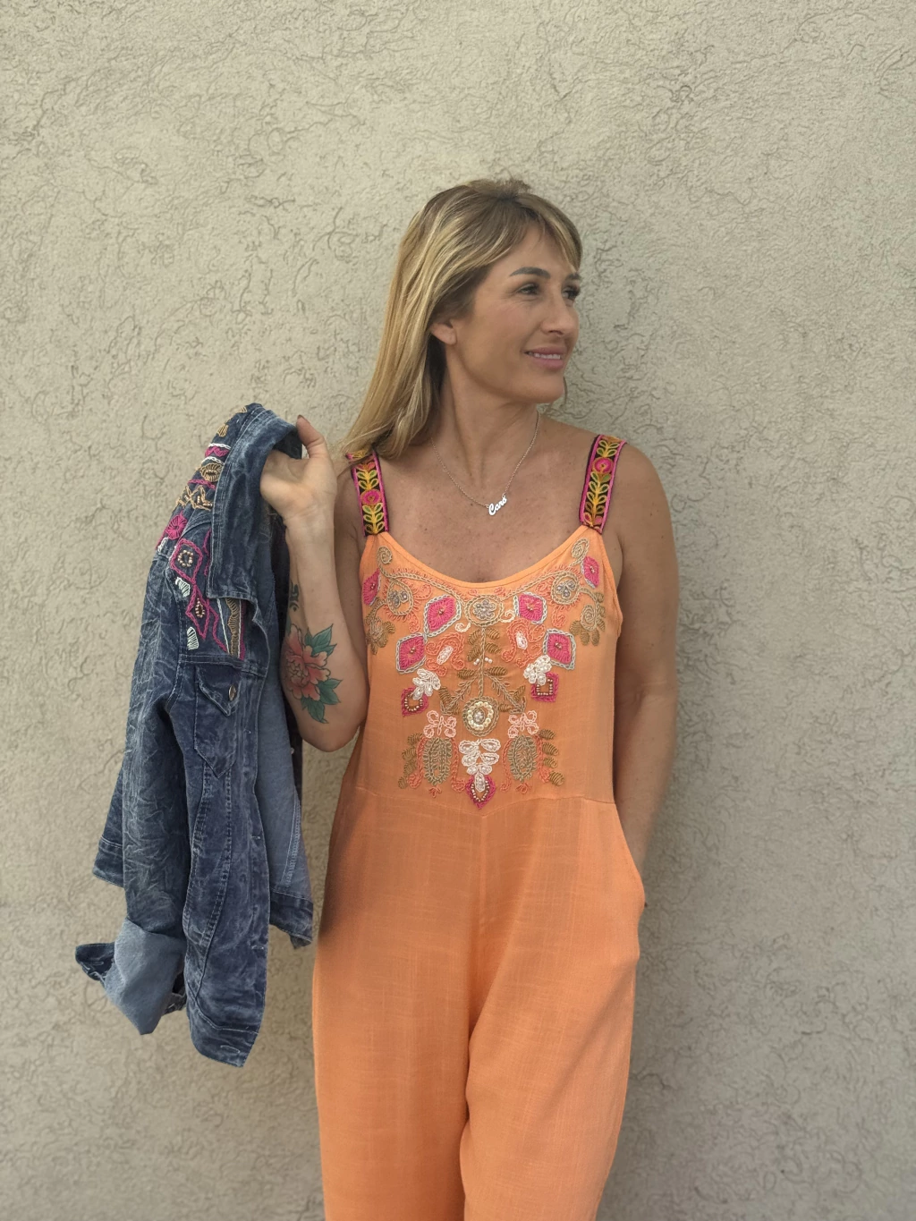 Set vibrante y luminoso formado por un mono color mango con bordado artesanal en tonos rosas, fucsias y dorados.