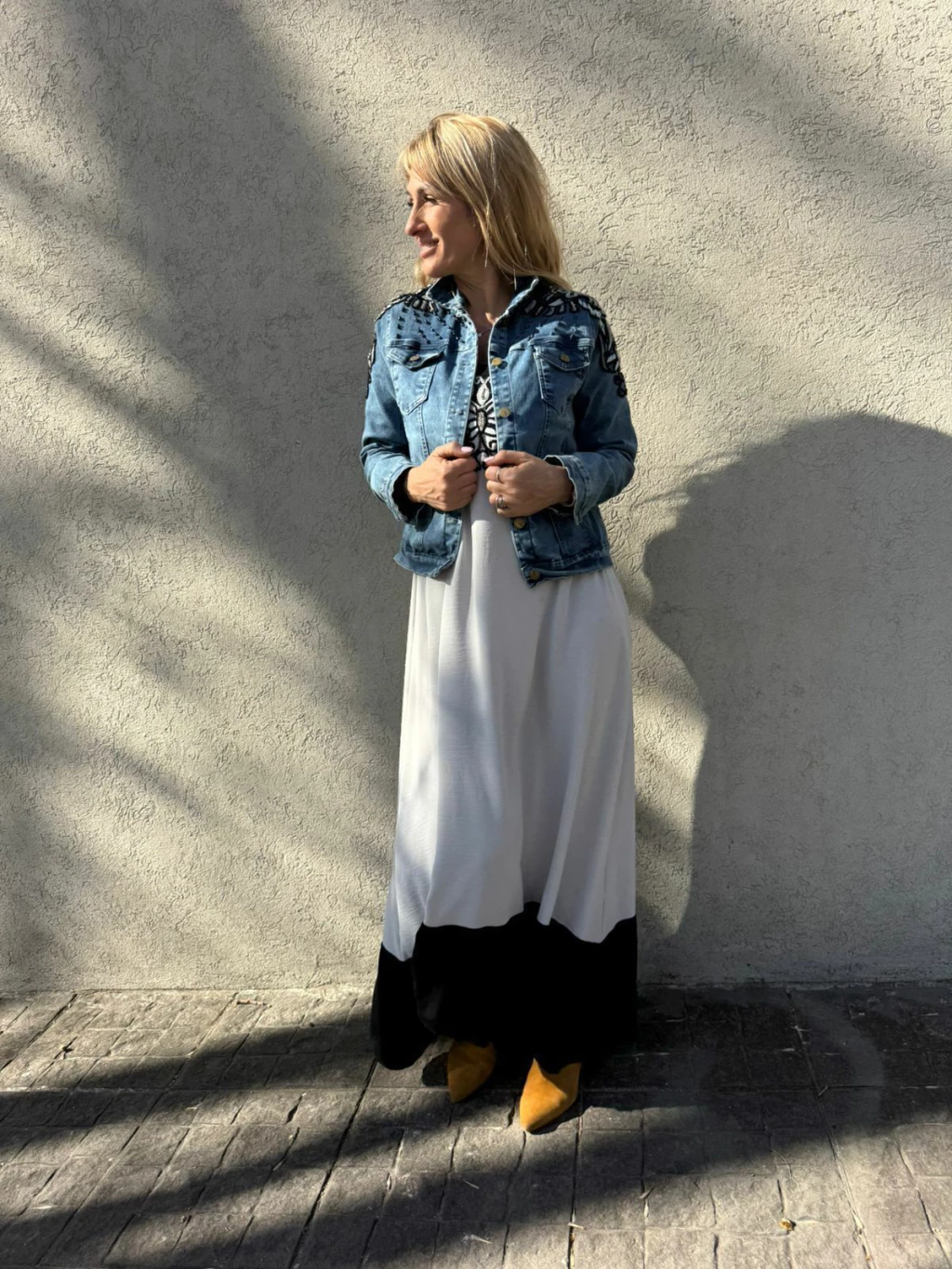 Vestido con bordado artesanal en el escote y chaqueta de jean intervenida con apliques de strass y canutillos.