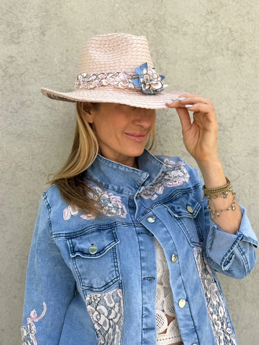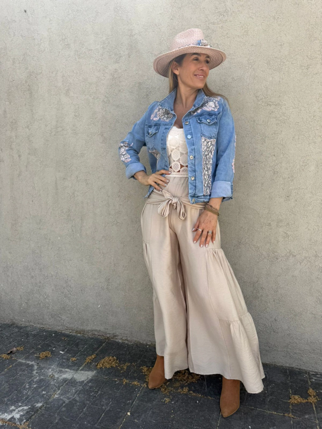 Chaqueta de jean con encaje bordado y detalles florales que la hacen única. Combina el clásico denim con la suavidad del encaje, creando un look romántico y canchero a la vez.