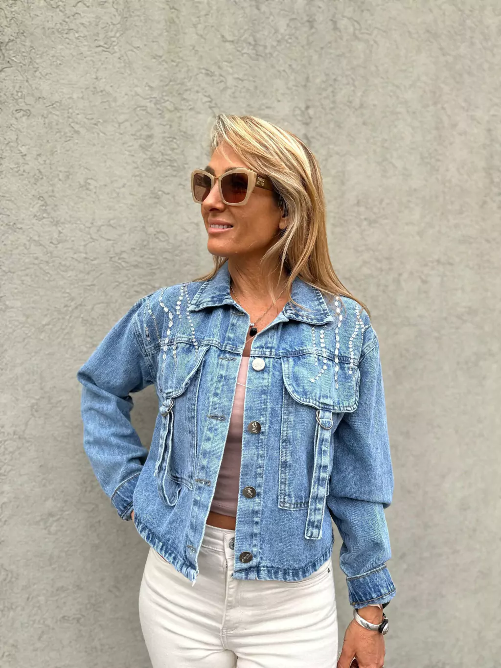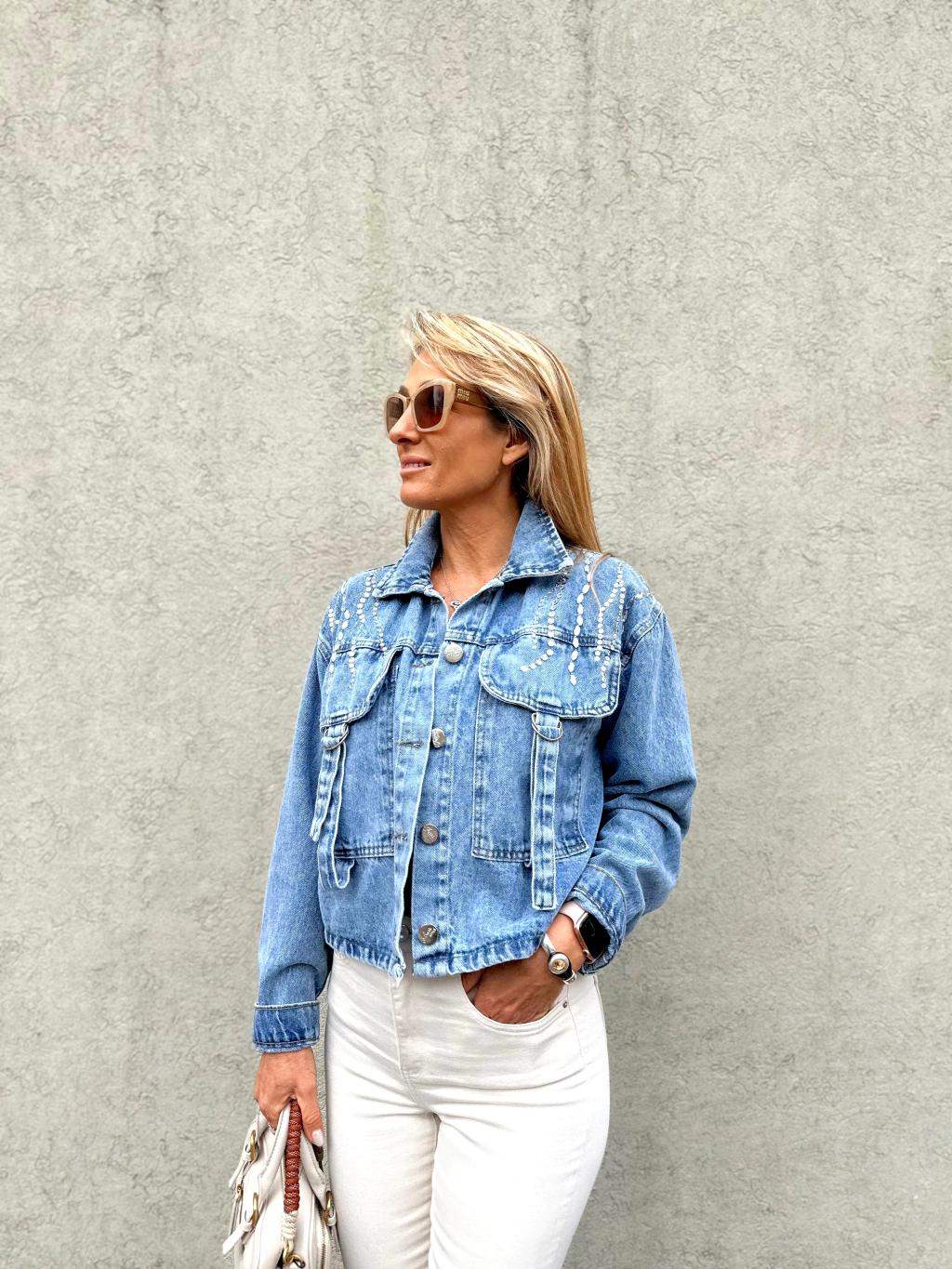 Chaqueta Denim Bordada a mano en el frente con aplicación de pedrería.