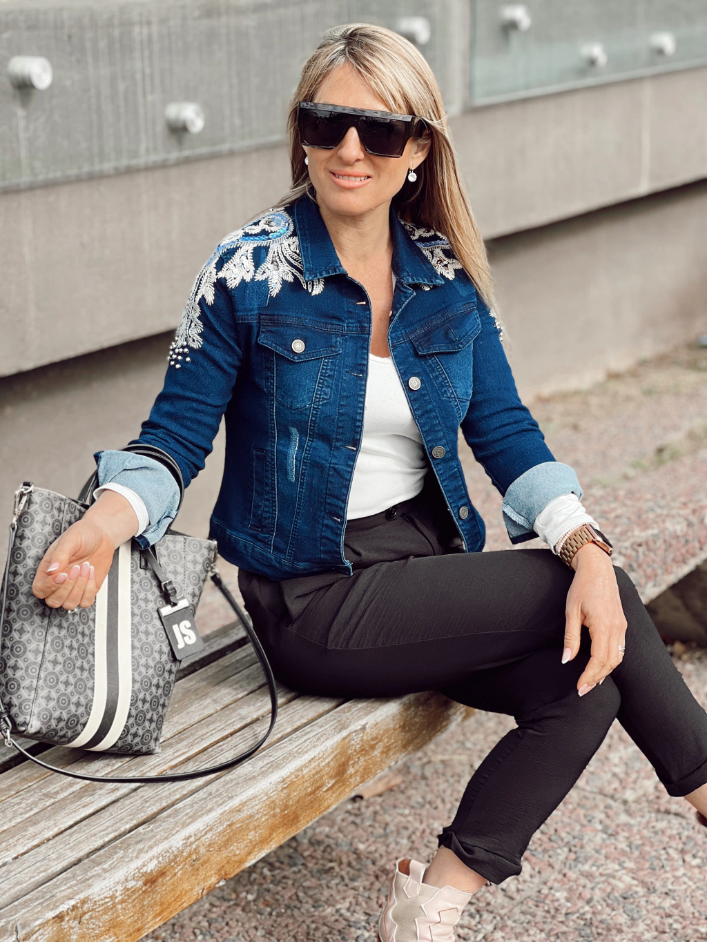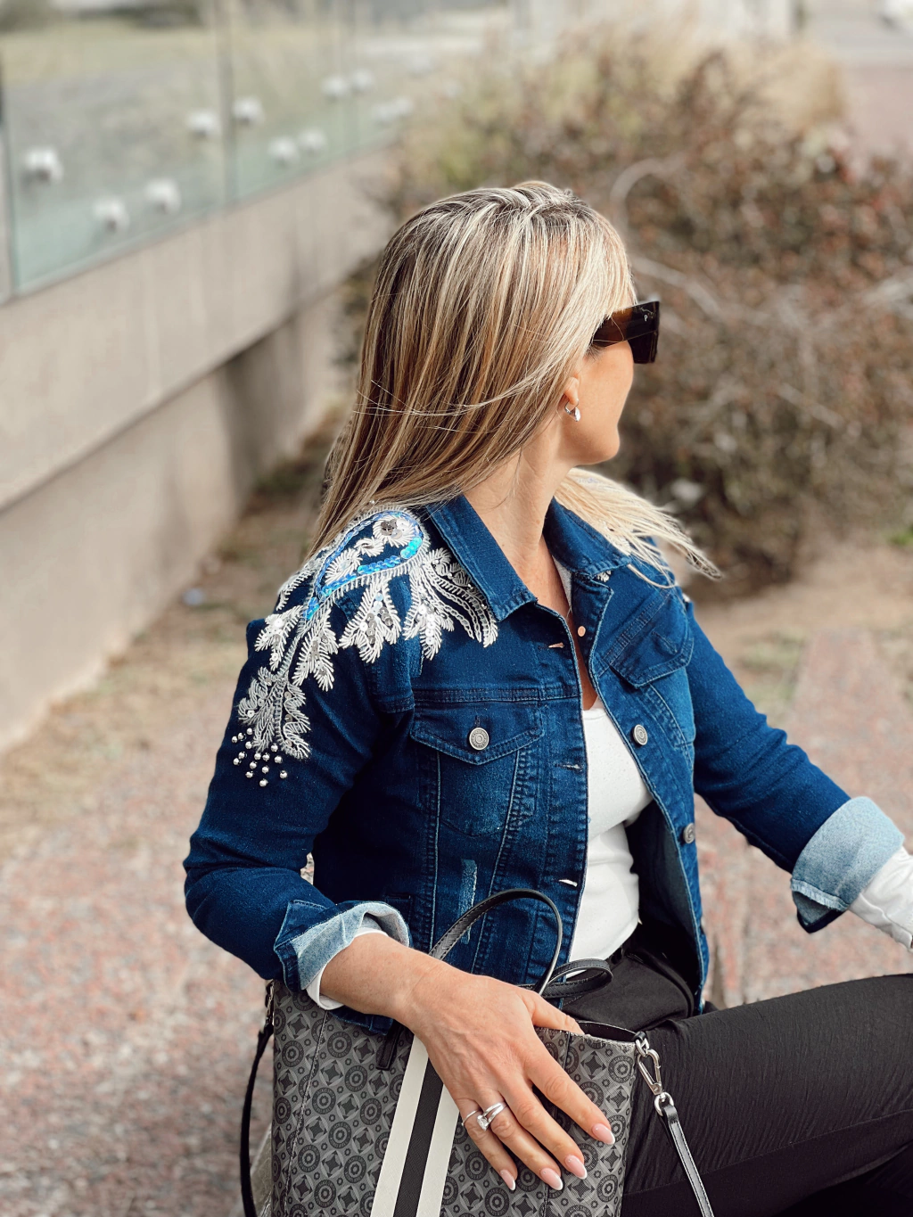 Chaqueta confeccionado en jean elastizado color azul. Esta bordada en tono neutro en los hombros con pedreria e hilos.