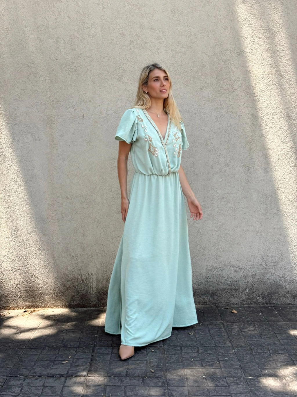 Vestido largo color acqua, cruzado adelante y con volado en mangas. Frunce en la cintura. Bordado a mano con pedrería, hilos y guarda.