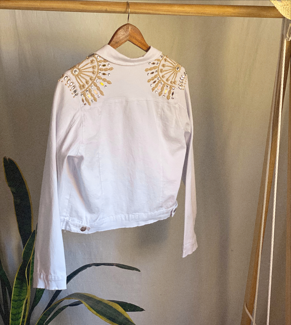 Chaqueta de gabardina elastizada blanca. Esta bordada a mano en hombros con pedrería e hilos en dorado.